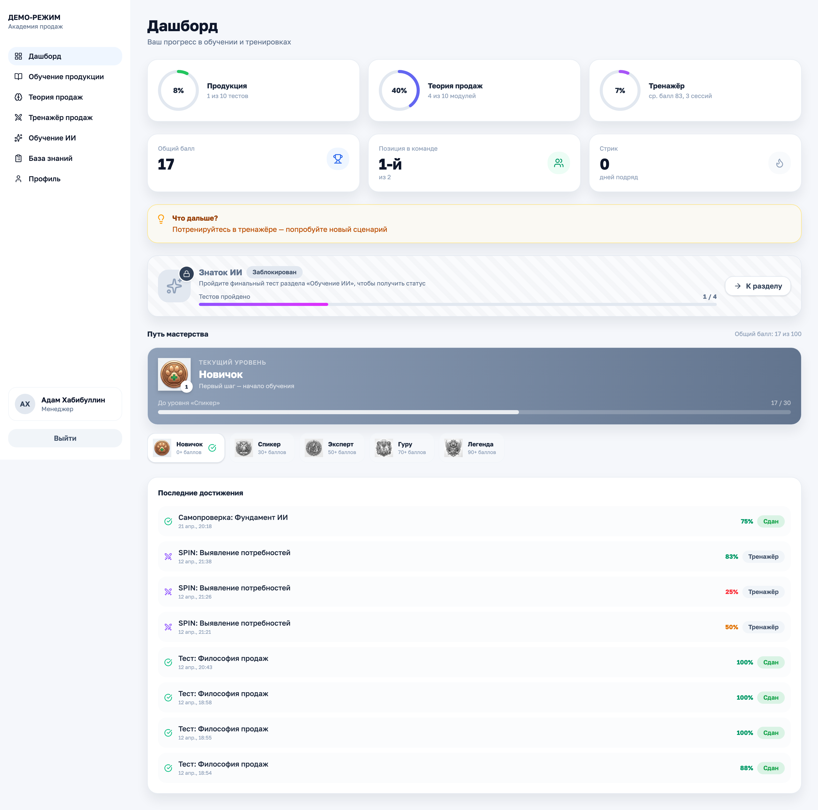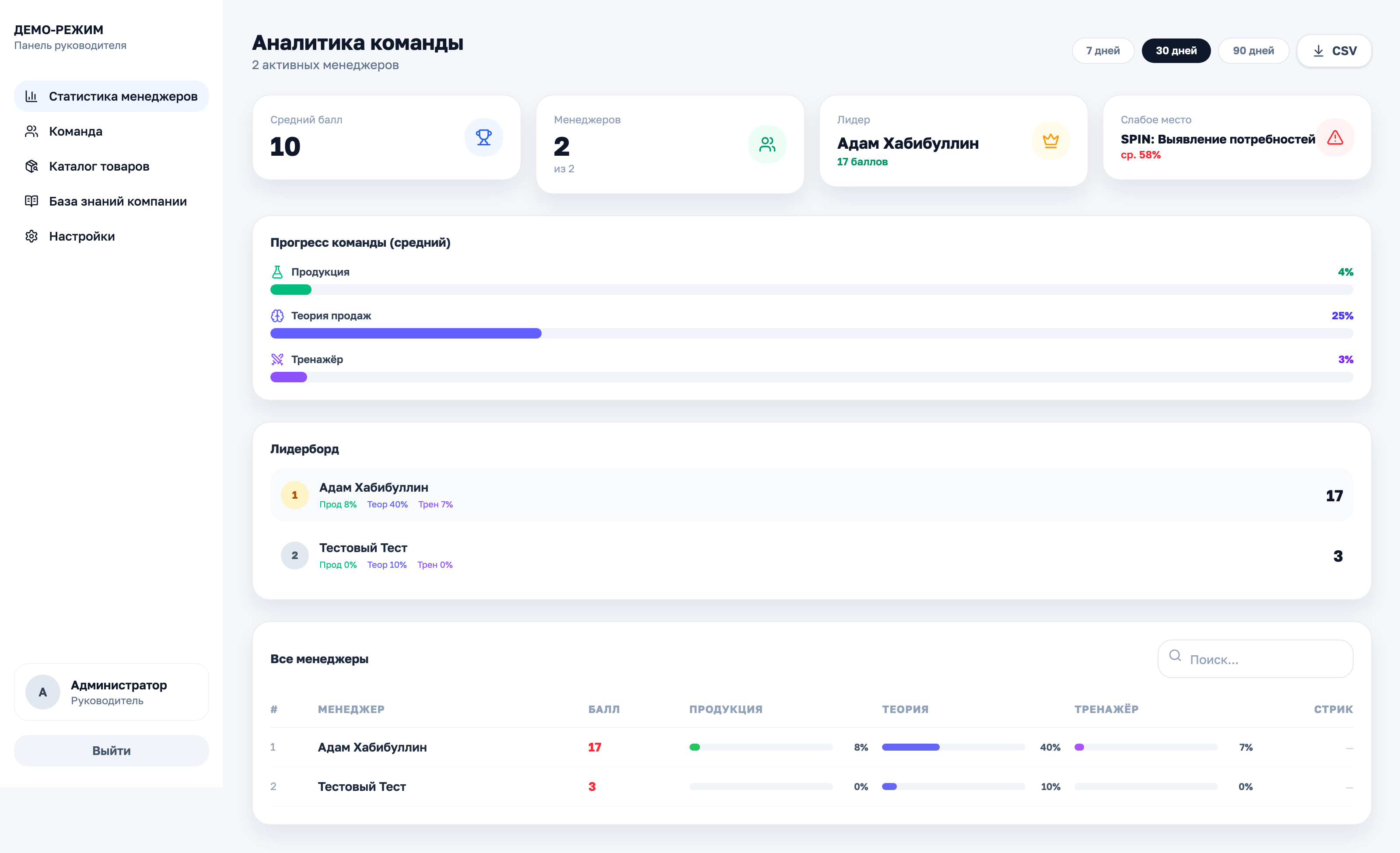 Менеджер видит свой прогресс и рекомендации. Руководитель — аналитику команды, самый слабый сценарий, лидерборд, детальную карточку каждого. Переключите роль, посмотрите как меняется экран.